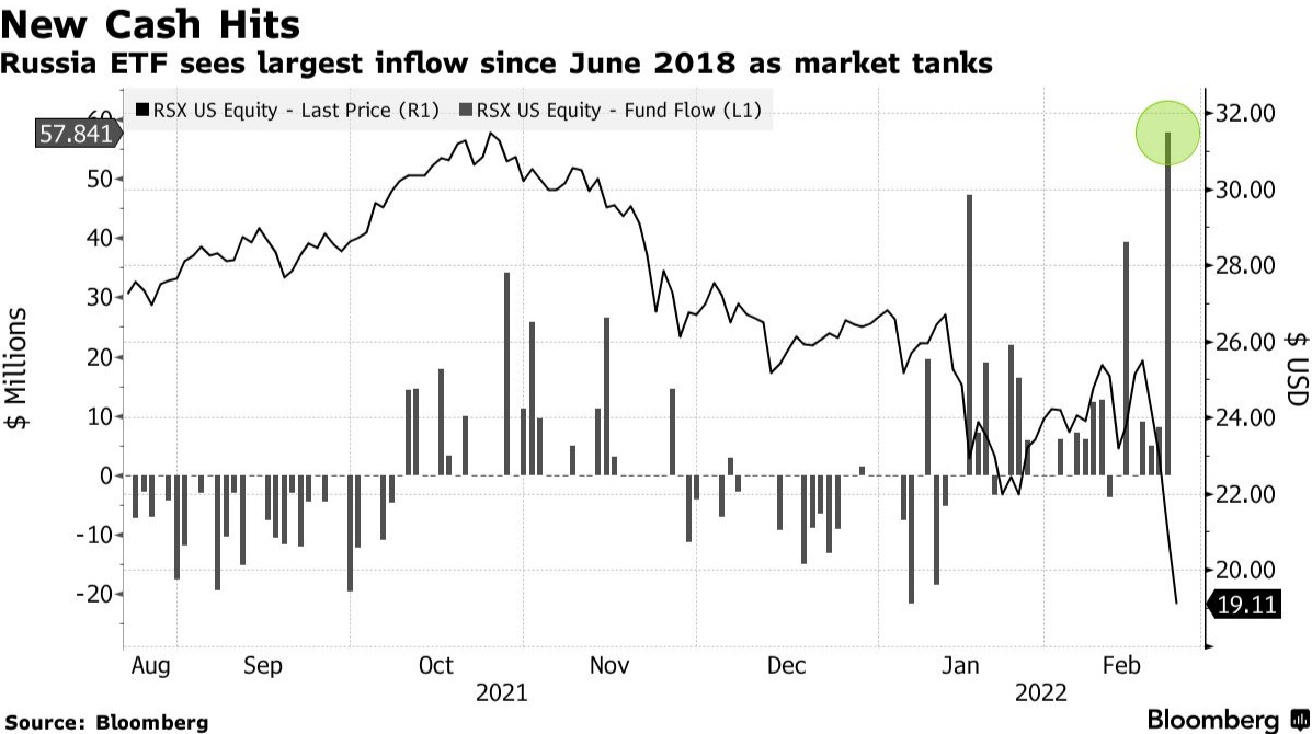 智通财经APP获悉,数据显示,在美国和欧洲将宣布将对俄罗斯发起制裁后,价值14亿美元的VanEck俄罗斯ETF (RSX.US)周二吸引了近5800万美元的资金流入,是自2018年6月以来的最高水平。