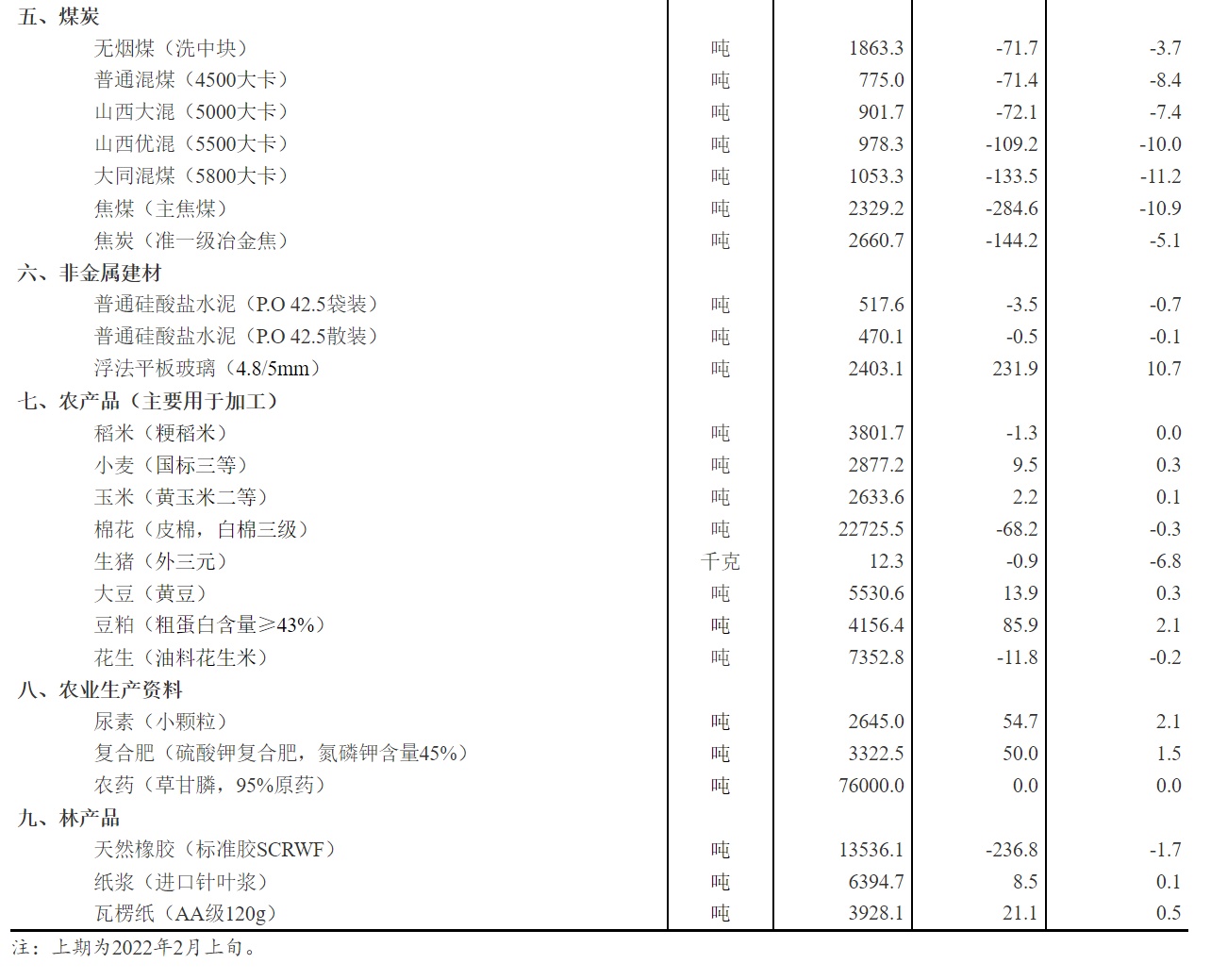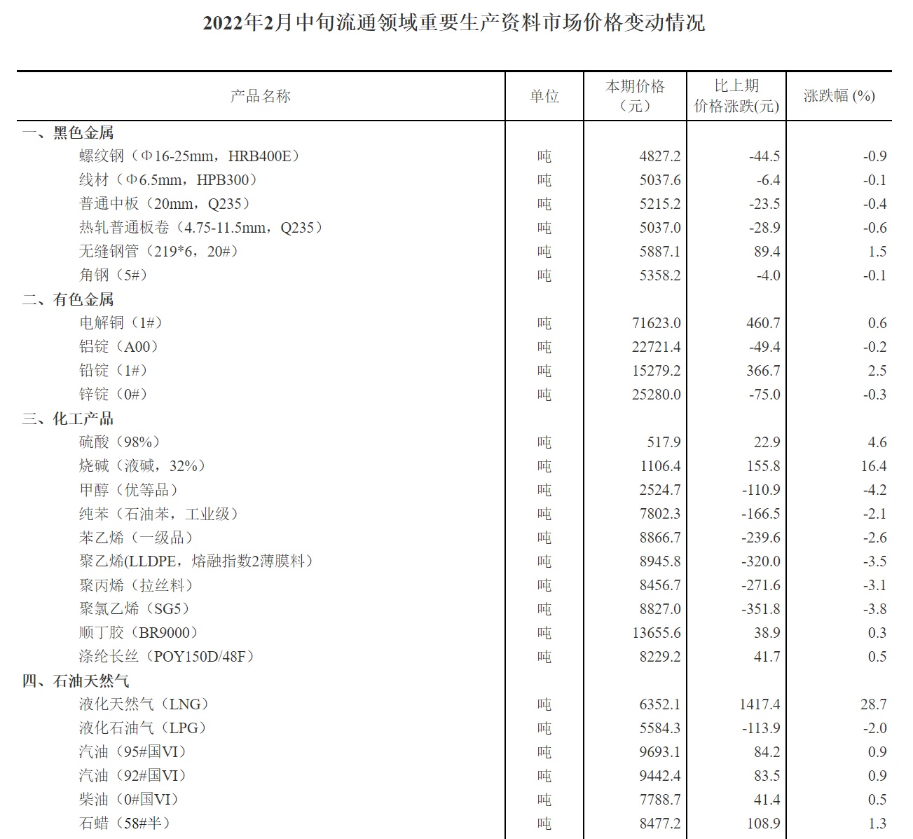 2022年2月中旬流通领域重要生产资料市场价格变动情况