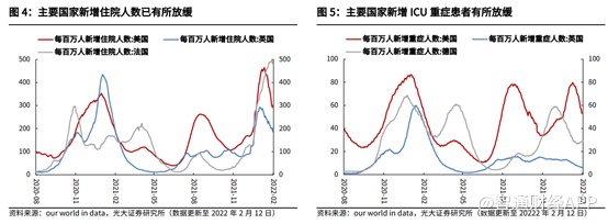 虽然奥密克戎传播性较强,但其导致的重症病例占比较低。2021年12月17日,南非卫生部长法赫拉表示,在本轮奥密克戎疫情中,只有1.7%的确诊病例入院,而在德尔塔病毒疫情同期,相关入院病例为19%。从近期主要国家的住院以及重症人数来看,伴随感染病例快速提升,新增住院人数增加较多且超过德尔塔时期峰值;而从新增重症病例来看,反弹相对不明显,且基本低于德尔塔时期峰值。