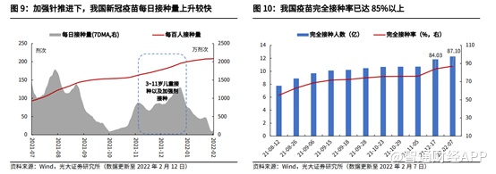 由于我国加强剂的接种需要与第二剂间隔6个月,因而我国加强剂的接种覆盖率提升只是时间问题。2022年2月初,我国两针接种覆盖率已达85%以上,按照当前第三剂加强针的接种进度,预计到6月底,我国第三剂加强针的覆盖率将达85%以上,将有效提升群众体内抗体水平,增强应对奥密克戎的保护性。