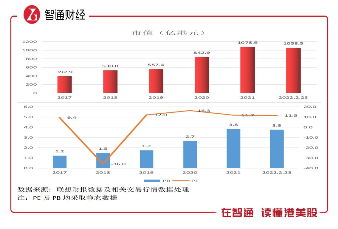 从联想集团过去五年市值及业绩变化看,2018年财年及2019财年业绩恢复增长,股价也得到反映,得以上涨,2020年受疫情影响所有下滑,但“宅经济”使得PC业务强势增长,获得资金追捧,2021年业绩持续创新高,股价也持续攀升。目前市值相比于2017年底上涨了1.7倍,但估值(PE)在12倍左右。可见,公司市值这几年的升幅,属于业绩增长驱动的价值回归。