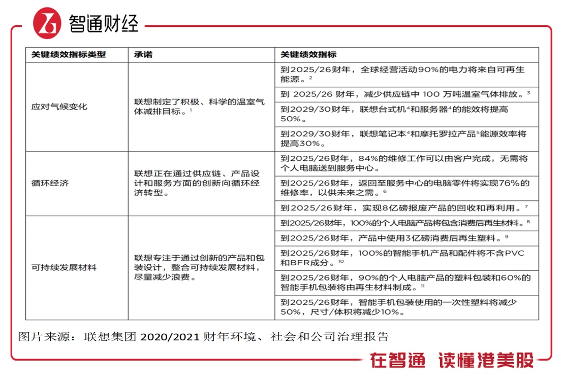 在过去几年,联想集团已经关注到了ESG投资趋势,在其2020/2021财年环境、社会和公司治理报告中,给出了三大指标的规划目标,其中在环境方面,减排目标是到2025/2026财年,全球经营活动90%的电力将来自可再生能源,减少供应链中100万吨温室气体排放。此外,在循环经济及可持续发展材料方面,公司也作出了详细的目标规划。