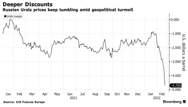 交易员表示,在事件升级之前,贴水还不仅仅是因为乌克兰的紧张局势。目前油价处于一种严重的现货溢价结构中,这并不利于俄罗斯原油的出售。此外,俄罗斯原油的含硫量也比欧洲其他许多受欢迎的原油高,在天然气价格高企的环境下,这使得其加工成本更高。