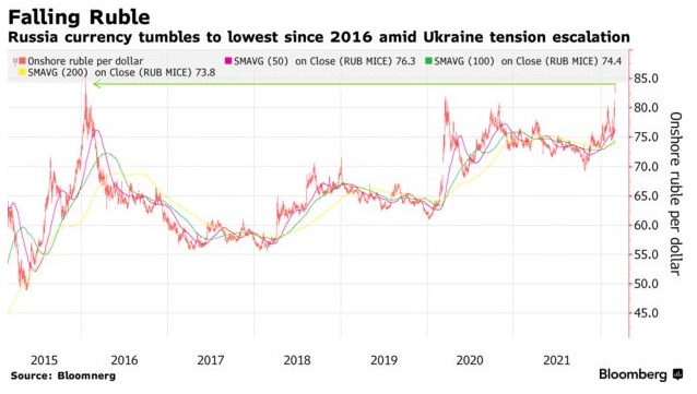 在岸汇率的变动反映了早些时候俄罗斯货币在离岸汇率上的下跌,在离岸汇率上,卢布下跌超过4%。在乌克兰地缘政治紧张局势升级后,卢布是2月份表现最差的新兴市场货币。