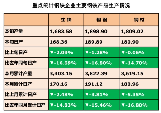 根据重点统计钢铁企业的产量进行估算,本旬全国共生产了粗钢2498.82万吨、生铁2031.50万吨、钢材3129.07万吨。其中,本旬全国日产粗钢249.88万吨、环比下降0.88%,日产生铁203.15万吨、环比下降176%,日产钢材312.91万吨、环比下降0.02%。