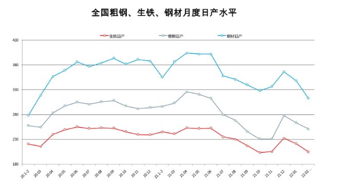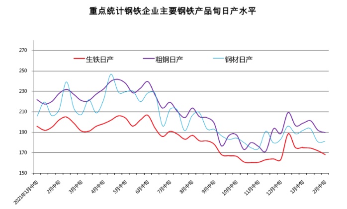 据此估算,2月份(即累计到2月中旬)全国粗钢日产250.99万吨、环比下降475%、同比下降15.38%;生铁日产204.97万吨、环比下降7.37%、同比下降16.45%;钢材日产312.94万吨、环比下降10.13%、同比下降11.88%。