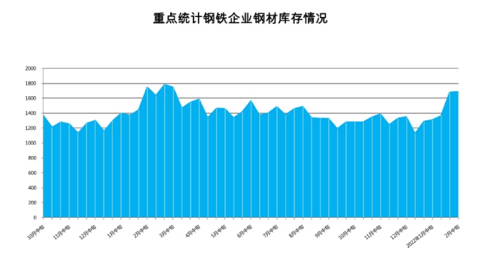 2022年2月中旬,重点统计钢铁企业钢材库存量1690.35万吨,比上一旬增加495万吨,增长0.29%;比上月底增加322.08万吨,增长23.54%;比上月同旬增加375.34万吨,增长28.54%;比年初增加560.66万吨,增长49.63%;比去年同期减少64.38万吨,下降3.67%。