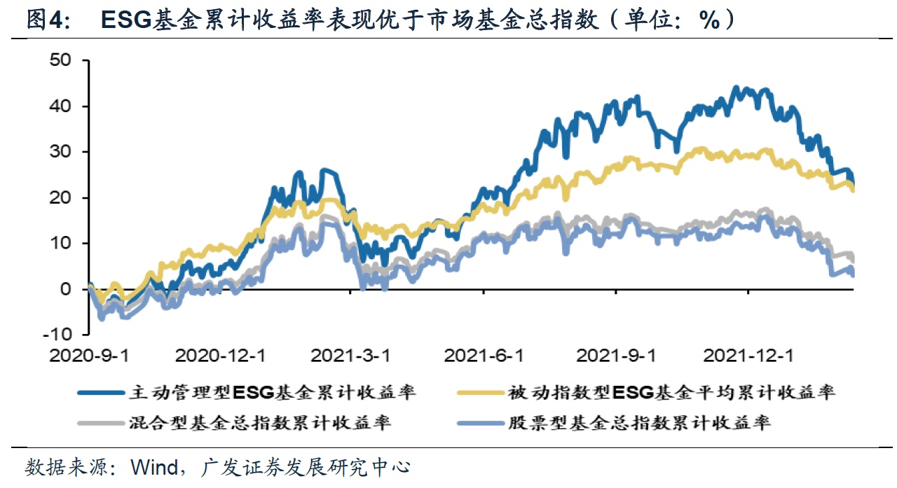 (1)“自上而下”引导ESG投资有助于弥合“双碳”资金缺口(根据发改委预测,“碳达峰”前每年资金缺口超过2.5万亿元);(2)“双碳”加持强化ESG主题投资的“进攻属性”,一方面,我国可持续主题基金近年来发展迅猛已超1200亿元规模,另一方面,ESG基金去年累计收益率整体跑赢市场,且主动型基金跑赢被动型基金。