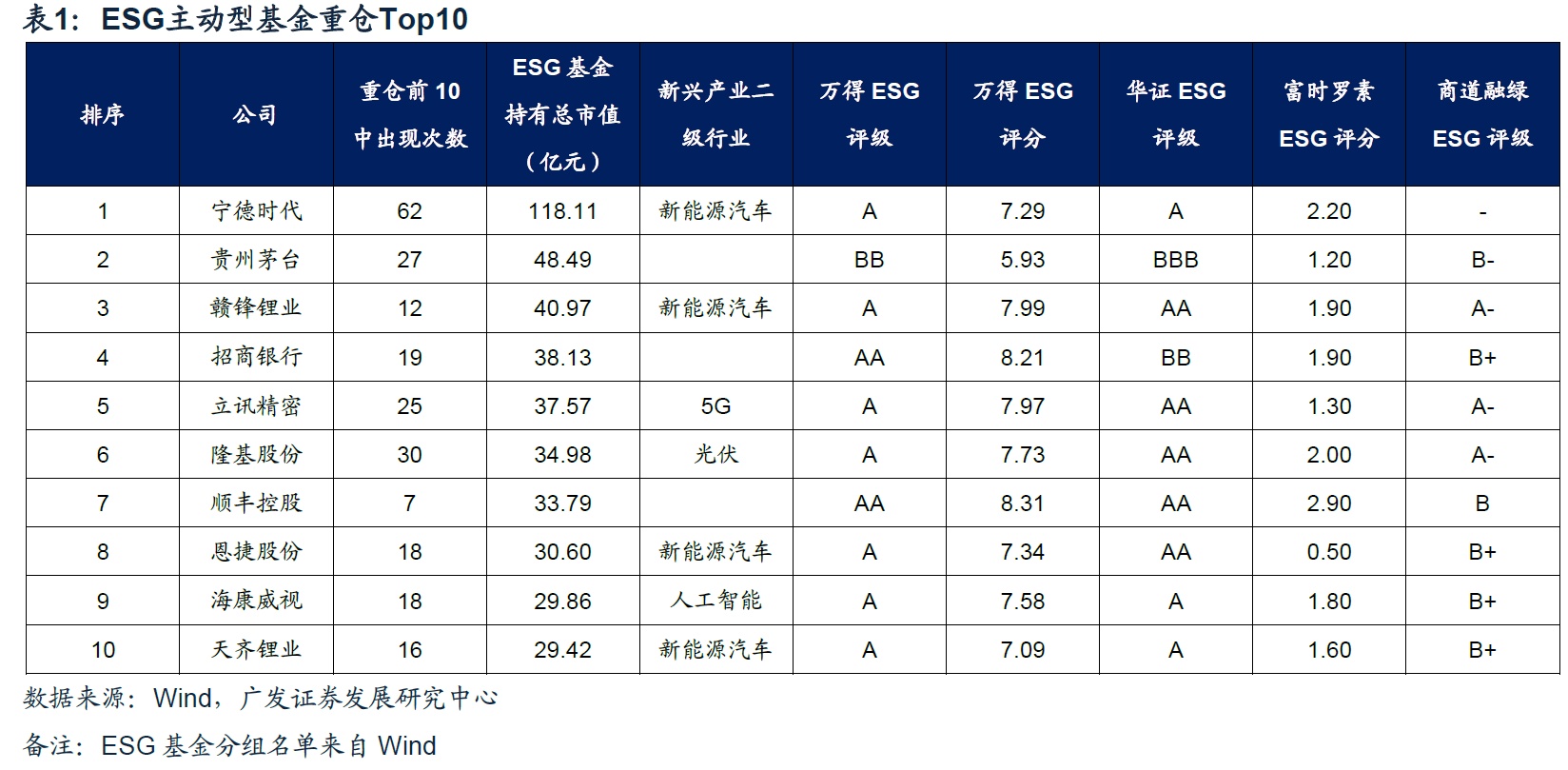 我们选取A股ESG相关基金(共215只,其中主动管理型164只),基于21Q4数据,通过统计每只主动管理型股票基金重仓Top10持仓,将其加总为“ESG主动型基金重仓Top10”名单,可以发现: