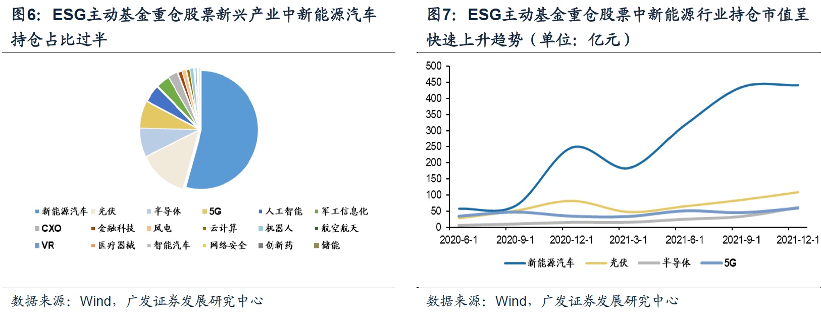 特征3:ESG主动基金重仓股中新能源行业动态持仓迅速上升。(1)静态视角:ESG主动基金重仓股票中新兴产业持仓占比59.09%,其中新能源汽车持仓占新兴产业总持仓54.56%(438.14亿元)。(2)动态视角:ESG主动基金重仓股票中新能源行业持仓快速上升,自20年Q2(57.68亿元)至21年Q4(441.92亿元),上涨约6.7倍。