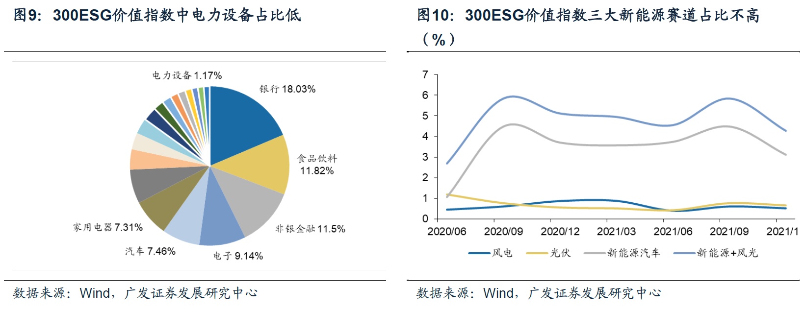 300ESG价值指数:(1)在申万二级行业排序上,电力设备权重很低,仅1.17%;(2)新能源汽车、光伏、风电三大新能源赛道占比不高且没有明显上升趋势,21年Q4三大新能源赛道总占比4.28%。