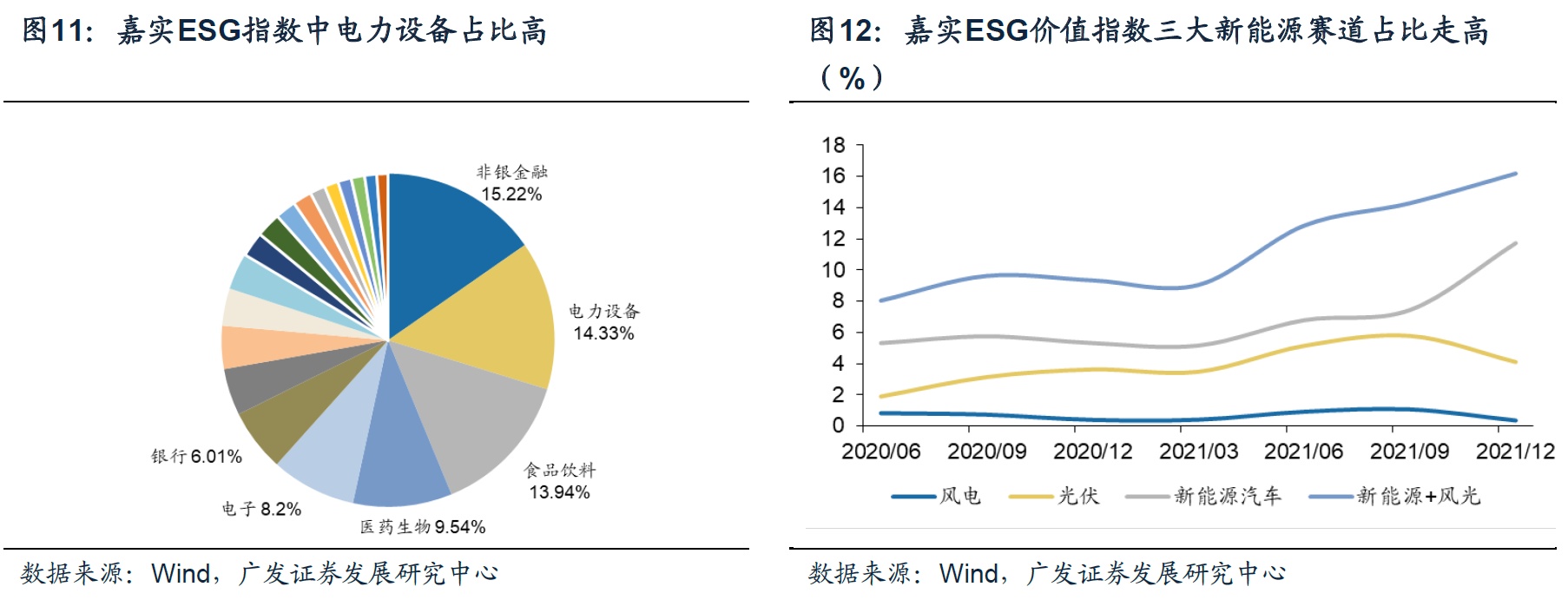 嘉实ESG价值指数:(1)在申万二级行业排序上,电力设备权重较高(14.33%),仅次于非银金融15.22%;(2)三大新能源赛道占比呈持续上升态势,21年Q4三大新能源赛道总占比16.19%,季度复合增速12.37%。