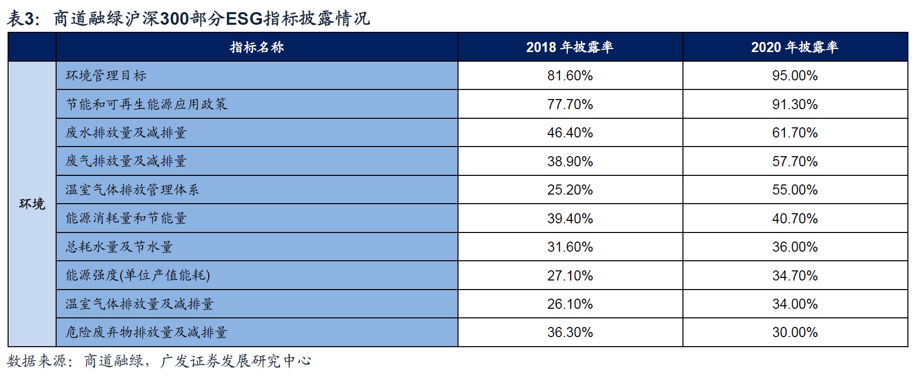 ESG评级体系中“双碳”指标现状:在信息披露方面,环境信息披露规则先行,上市公司需按照重点排污单位分类进行环境信息披露,重点排污单位已实行部分指标强制披露,非重点排污单位公司不披露则解释,鼓励公司自愿披露其他环境信息。2022年1月生态环境部出台《企业环境信息依法披露格式准则》中的年度报告规定了关键环境信息提要、企业基本信息、企业环境管理信息、污染物产生、治理与排放信息、碳排放信息等内容;临时报告规定了企业产生生态环境行政许可变更、生态环境行政处罚、生态环境损害赔偿等信息。但目前 ESG中环境指标多数无统一披露报告,数据缺失、分散化仍是影响“双碳”指标在ESG评级体系中的应用、赋权的主要阻力。以商道融绿ESG为例,2018-2020 年多数环境指标披露率有大幅增长,如温室气体排放管理体系由25.2%上升至至55%实现了一倍以上的增长,平均披露率由43.03%上升至53.61%,但整体披露率仍不高,还有较大的发展空间。
