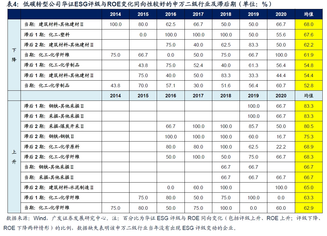 研究数据及方法:我们选取申万一级行业中,钢铁、建筑材料、化工、采掘四个高污染转型企业,分别从评级上升与下降两个角度,考察其分类下的17个二级行业自 2013-2020年年末的华证ESG评级与ROE之间变化的同向性。考虑到对于部分行业ESG评级可能是ROE的先行指标,我们分别从当期、ROE滞后1期、ROE滞后2期进行分析。最后,我们选取变动比例均值在50%以上,同时考虑到数据的偶然性剔除数据量过小以及有两个年度同向比例小于40%的行业与滞后期为ESG评级与ROE同向性较好的行业。
