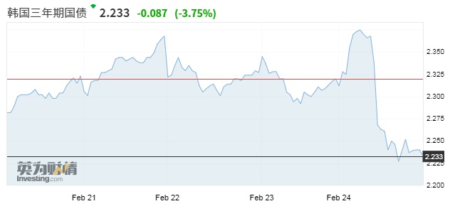 最新事态发展也令韩国国债收益率由涨转跌,抵消了韩国央行鹰派立场的影响。截至发稿,韩国三年期国债收益率下跌3.75%,至2.233%。韩元兑美元下跌0.84%。
