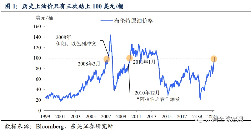 2月24日俄罗斯炮火点燃乌克兰,同样被点燃的还有原油(ICE布伦特原油期货价格,下同),油价史上第三次突破100美元/桶的大关,我们在之前的报告《PPI“死灰复燃”的三大风险点》中提到,2022年原油供需格局将继续偏紧,站上100美元是大概率事件,只是东欧地缘政治危机的爆发使得这一幕提前来临。无独有偶,前两次油价站上100美元(2008年和2011年)也有地缘政治事件的“火上浇油”,却有着大不相同的结果。