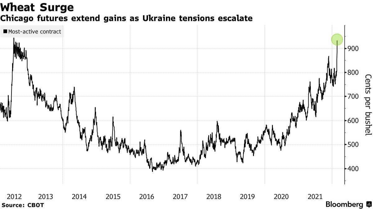 据悉,乌克兰和俄罗斯都是粮食和食用油的主要供应国,其约占全球小麦贸易的四分之一,玉米销售的五分之一,葵花籽油出口的80%。因此,俄乌冲突升级后,将小麦价格推高至2012年以来的最高水平。此外,由于南美大豆收成前景黯淡威胁到全球供应,大豆期货价格攀升至9年多以来高点。