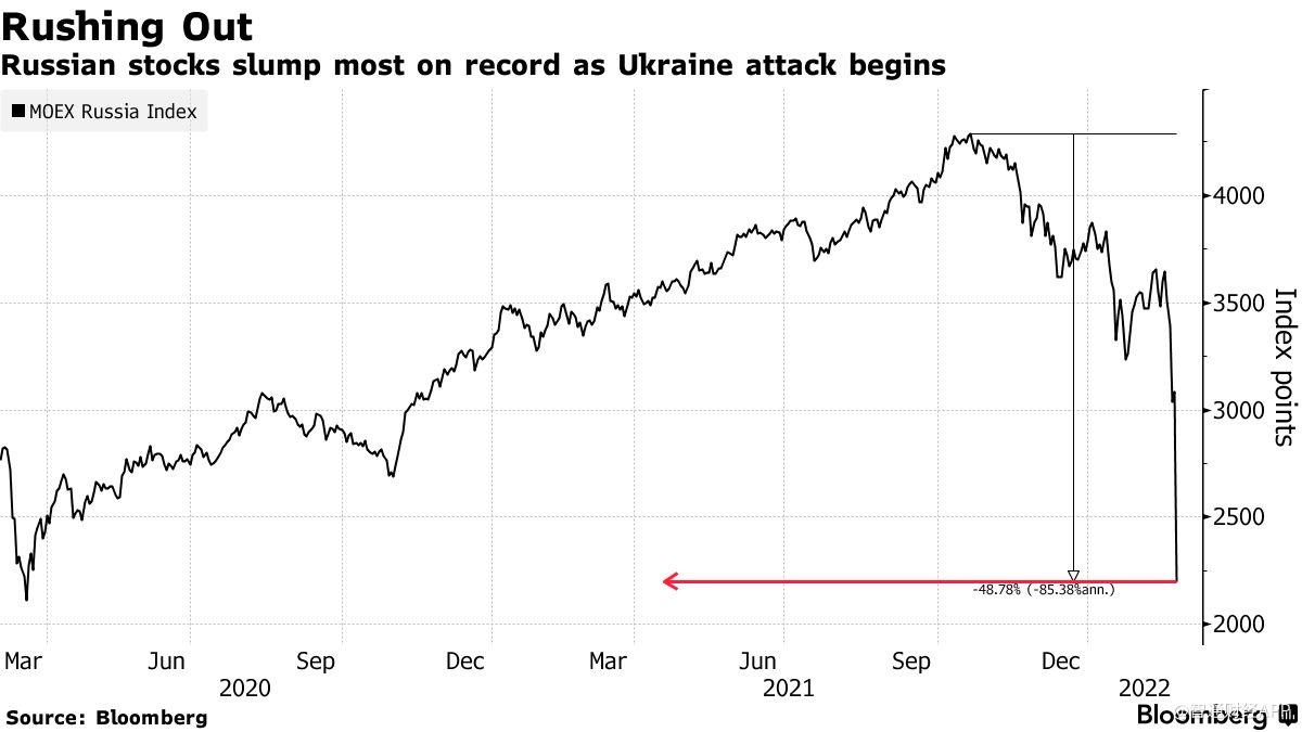 智通财经APP获悉,俄罗斯股市周四创下历史最大跌幅,市值缩水超过1500亿美元。此前,俄罗斯总统普京下令对乌克兰实施“非军事化”行动,乌克兰各地的目标遭到袭击。目前,俄罗斯RTS指数日内跌幅达40%,俄罗斯MOEX指数跌36.4%。