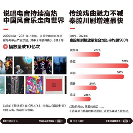 流行歌曲成为新国潮,传统曲艺也再次焕发青春。网易云音乐发布的《华语乐坛趋势报告(2022)》显示,传统戏曲魅力不减,秦腔、川剧、南音、昆曲等众多类型戏曲的播放量持续上升。2019-2021年,秦腔和川剧播放量增长最快,年复合增长率均超500%。