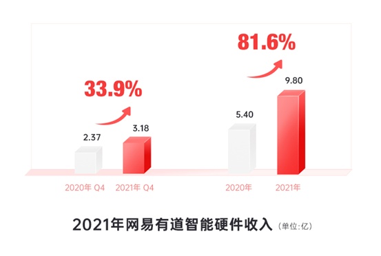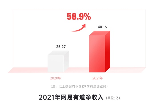 2021年全年,不包含K9学科培训业务口径下有道实现净收入40.16亿元,同比增长58.9% 。其中课程服务的净收入为 24.41 亿元,同比增长61.3%; 智能硬件净收入9.8亿元,同比增长81.6%;在线营销服务净收入5.94亿,同比增长 25.6%。