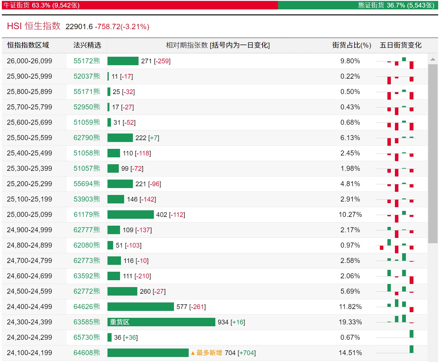法兴恒指牛熊证街货分布图中的数据显示,熊证街货重货区在24300-24399区间,该区间最新熊证数量为934张,较上一交易日增加16张;最多新增在24100-24199区间,该区间最新牛证数量为704张,较上一交易日增加704张。