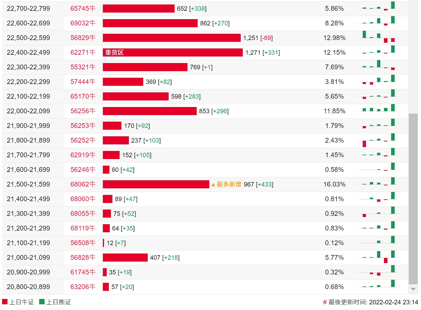 牛证街货重货区在22400-22499区间,该区间最新牛证数量为1271张,较上一交易日增加331张;最多新增在21500-21599区间,该区间最新牛证数量为967张,较上一交易日增加433张。