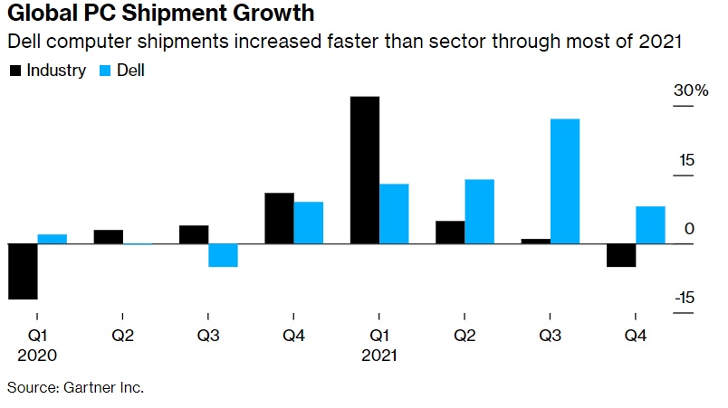 由于远程工作和教育的兴起,该公司各项业务在新冠疫情期间蓬勃发展,总净营收连续八个季度超过分析师普遍预期。第四季度戴尔个人计算机(PC)出货量达1720万台,同比增长9%。研究机构Gartner Inc.上个月报告称,戴尔PC出货量在第四季度同比增长7.9%,而行业总出货量同比下降5%。