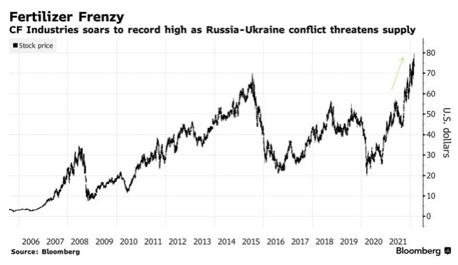 在氮肥价格飙升背景下,美国主要氮肥生产商CF工业控股(CF.US)股价周四盘中一度创下历史新高79.81美元,最终收涨5.48%。Green Markets分析师Alexis Maxwell表示:"出口减少将首先收紧北半球农产品市场的供需平衡,同时也将令CF工业控股,及其同行美国美盛(MOS.US)和Nutrien(NTR.US)等受益。"