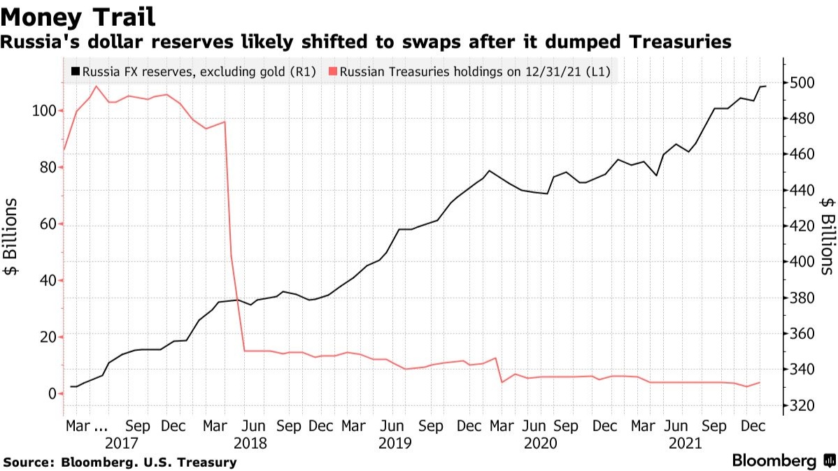 Pozsar写道,俄罗斯央行和私营部门拥有近1万亿美元的流动财富,其中以美元持有的份额比大多数人意识到的要大得多,即使在2018年俄罗斯出售了所有美国国债之后也是如此。该策略师估计约有2,000亿美元以外汇掉期形式存在,另外还有1,000亿美元存在外国银行,而这一数额足以大幅改变融资市场。
