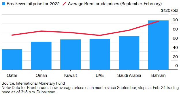俄乌冲突发生后,原油价格自2014年以来首次突破每桶105美元,延续了此前全球各经济体重新开放后需求上升所推动的涨势。包括沙特阿拉伯、阿联酋在内的OPEC+成员国有望因为油价持续上涨获得更大收益,就连中东地区最小经济体巴林也有可能实现自2008年以来的首次预算平衡。
