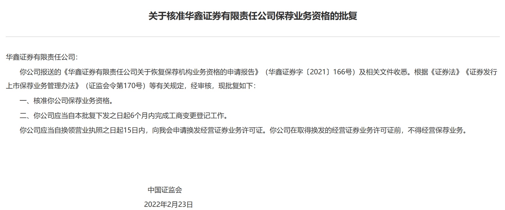 智通财经APP获悉,据证监会2月25日消息,证监会发布关于核准华鑫证券有限责任公司保荐业务资格的批复。其中指出,核准华鑫证券保荐业务资格,公司应当自本批复下发之日起6个月内完成工商变更登记工作。华鑫证券应当自换领营业执照之日起15日内,向证监会申请换发经营证券业务许可证。公司在取得换发的经营证券业务许可证前,不得经营保荐业务。