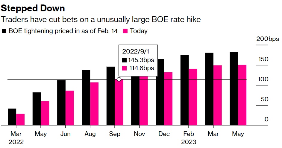 交易员们正在减少对英国央行在下次会议上加息50个基点的押注。此前,俄乌冲突全面升级,政策制定者发表了更为谨慎的言论,此前他们曾投票支持更大幅度的加息。