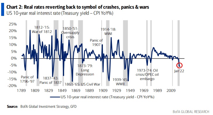 美银策略师Michael Hartnett表示,地缘政治正在加剧2022年的通胀、利率和增长冲击,实际利率已降至负值,和过去250年来“崩盘、恐慌和战争”时期的水平相当。