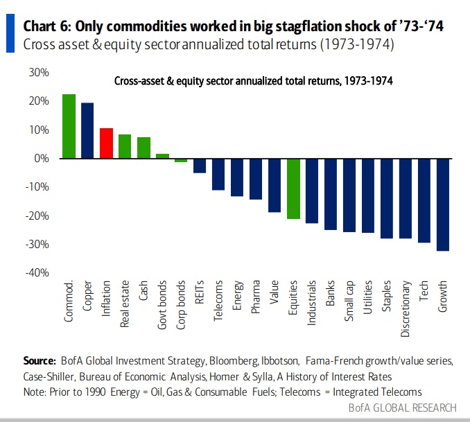 Hartnett表示,投资组合应该为滞胀和美元贬值做好准备,20世纪70年代看涨的资产包括实物资产、大宗商品、通胀保值债券(TIPS)、小盘价值股、新兴市场股票等。