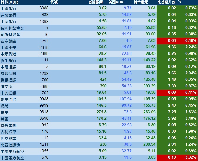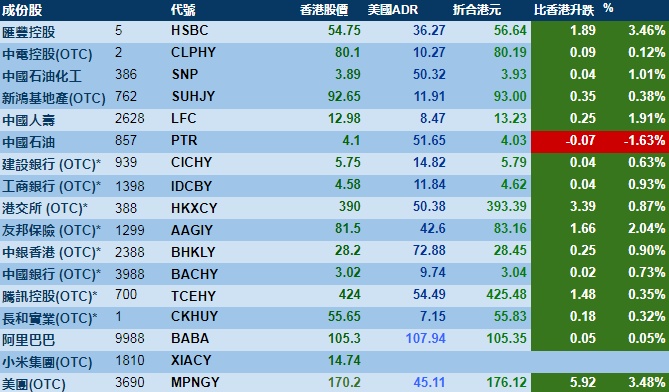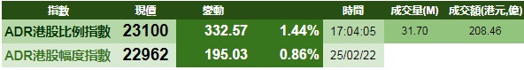 智通财经APP获悉,周五美股三大指数集体收涨,港股ADR指数也上涨,按比例计算,收报23100点,较香港收市涨332.57点,幅度为1.44%。