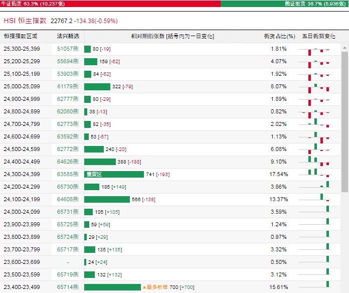 法兴恒指牛熊证街货分布图中的数据显示,熊证街货重货区在24300-24399区间,该区间最新熊证数量为741张,较上一交易日减少193张;最多新增在23400-23499区间,该区间最新熊证数量为700张,较上一交易日增加700张。