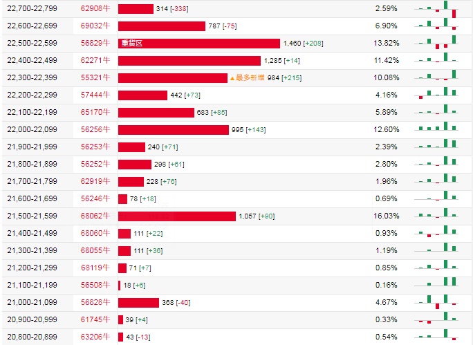 牛证街货重货区在22500-22599区间,该区间最新牛证数量为1460张,较上一交易日增加208张;最多新增在22300-22399区间,该区间最新牛证数量为984张,较上一交易日增加215张。