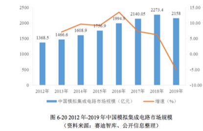 从信号分类上来看,集成电路可分为模拟集成电路和数字集成电路。其中,模拟集成电路是集成电路行业的重要组成部分,占比约为13%。根据IDC数据,中国模拟集成电路市场约已成为全球模拟集成电路需求最大的市场,占全球市场的36%。而中国模拟集成电路规模已由2012年的1368.5亿元增长至2019年的2158亿元,年均复合增长率达6.72%。