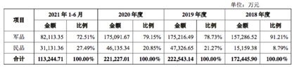不过,相比民用,公司军品收入占比更高。招股书显示,军品收入占比分别为91.21%、78.73%、79.15%、72.51%,民品收入占比分别为8.79%、21.27%、20.85%、27.49%。
