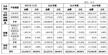 在产品方面,公司建立了以化合物半导体为核心的技术体系和系列化产品布局,产品覆盖射频芯片、模块、组件。其中,T/R组件和射频模块为公司主要收入来源,该业务收入于报告期内保持增长,分别为12.71亿元、14.99亿元、15.10亿元、9.59亿元,占比分别为73.72%、67.37%、68.25%、84.65%。