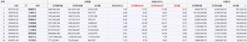 从北向资金持股市值的变化来看,赛道股全面开花。光伏、锂电、新能源车等新能源赛道股被雨露均沾,隆基股份、宁德时代、阳光电源、恩捷股份、三花智控等持仓市值均出现大幅增加。其中,隆基股份的持仓市值增加最多,增加了45.12亿元,持股比例上升0.12%,宁德时代持仓市值增加38.72亿元,持股比例上升0.02%。