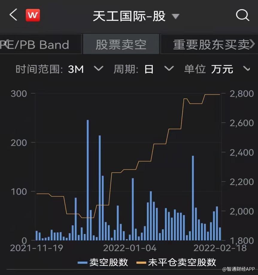 据wind数据显示,自2021年12月中旬开始,天工国际未平仓卖空股票数量便持续增长,从1953.4万股一路涨至2月15日时的2791.8万股,增长近43%。粗略估算下,这一过程中的做空平均成本大概在4.2港元左右,即这期间新增的做空股份的成本或超3500万港元。