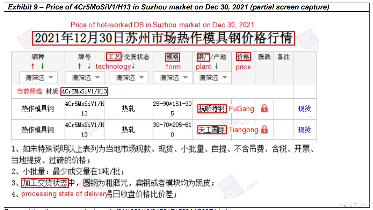 艾默生还从产品售价以及成本两个角度论证了天工国际的EBIT利润率被夸大,但其所用数据实在难以让人信服。为证明天工国际的模具钢产品价格低,艾默生在mysteel上对比了天工国际与抚顺特钢的产品4Cr5MoSiV1/H13的售价,从而得出此结论。