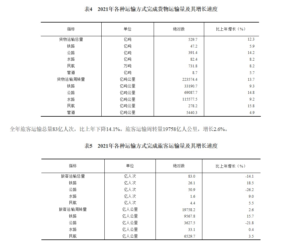 [29]货物运输总量及周转量包括铁路、公路、水路、民航和管道五种运输方式完成量,2021年增速按可比口径计算。