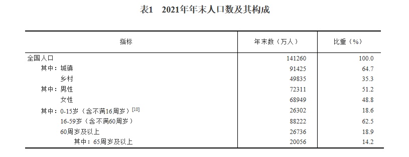 [10]2021年年末,0-14岁(含不满15周岁)人口为24678万人,15-59岁(含不满60周岁)人口为89846万人。