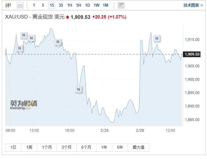 现货黄金周一报每盎司逾1900美元,有望录得去年5月以来最佳单月表现。