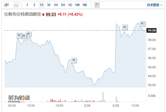 随着乌克兰危机加剧,布伦特原油期货周一升至每桶100美元以上,而WTI原油期货价格接近每桶96美元。