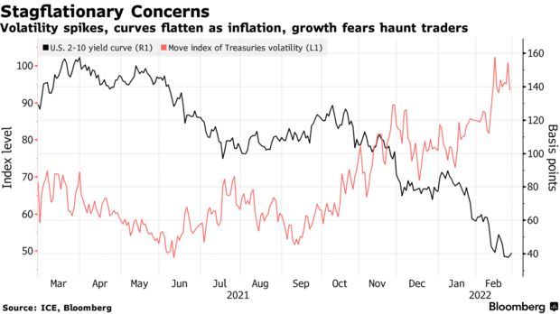 由于俄乌冲突可能会冲击两国的供应,石油、天然气和其他大宗商品价格飙升,债券市场衡量短期通胀预期的指标已跃升至纪录高位。与此同时,两年期和十年期国债收益率差上周收窄至2020年3月以来的水平,表明市场预期经济将放缓。