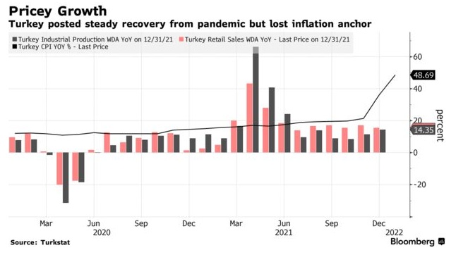 土耳其统计机构称,土耳其全年的经济增长率为11%,使其成为20国集团(G20)中上一季度和2021年整体增长最快的国家。土耳其从新冠疫情中复苏的步伐在今年上半年加快,并得益于强劲的出口保持了经济增长势头。土耳其总统埃尔多安迫使政府降低借贷成本,但此举同样导致通胀失控,这削弱了该国2022年的经济增长前景。