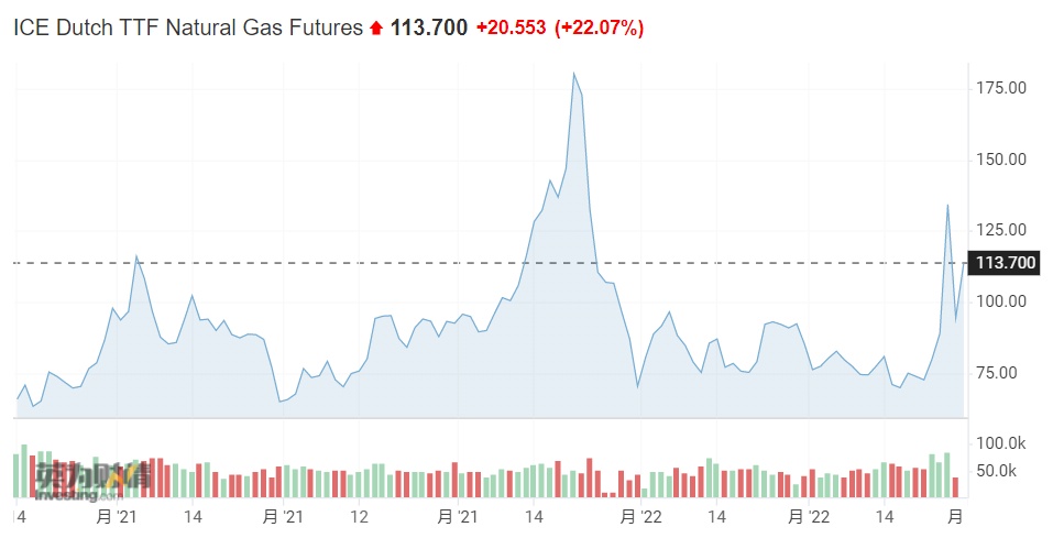 智通财经APP获悉,由于欧美对俄罗斯的又一轮制裁加剧了人们对能源短缺的担忧,欧洲天然气价格一度飙升36%。